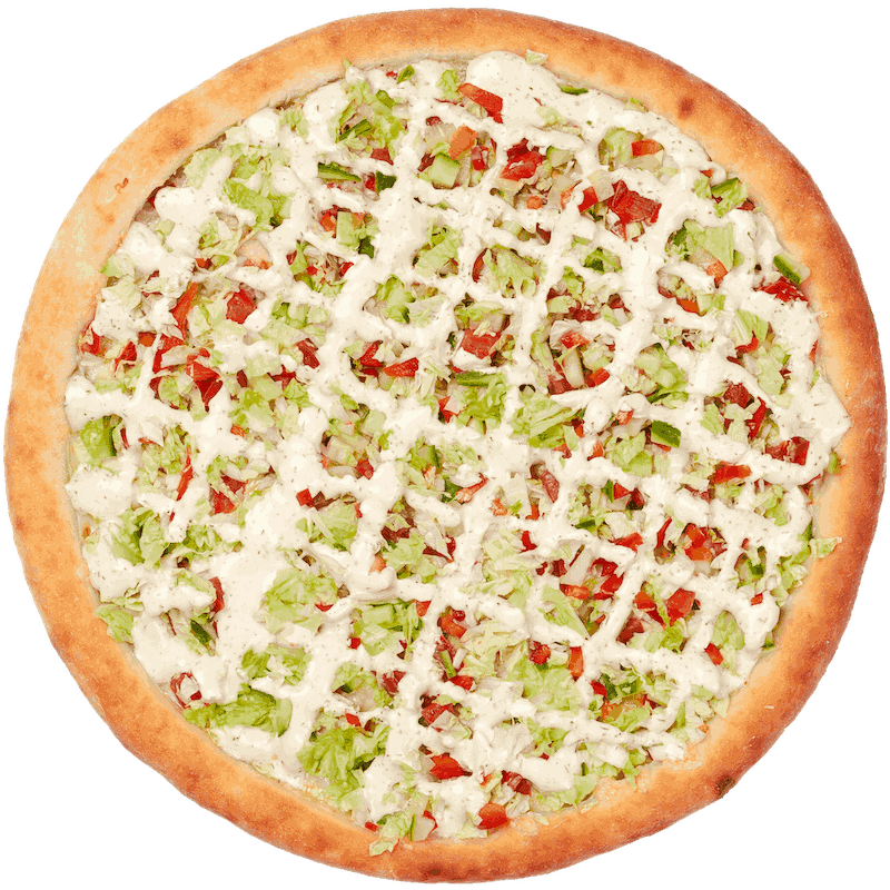 Fresh veggies and mozzarella blend over tomato sauce, delivering a balance of flavor and crunch.